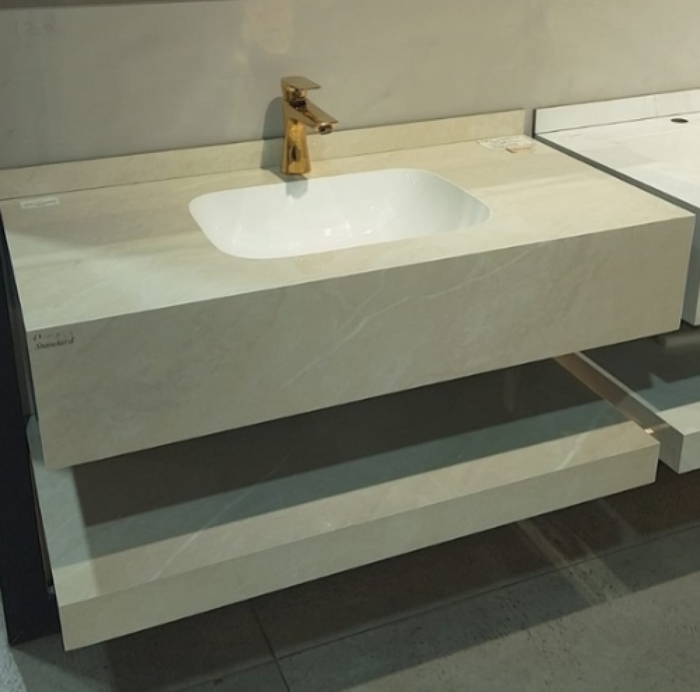مغسلة بورسلان 120سم hot bending حوضين باضاءة لمس OS162 ترافرتينو رمادي فاتح